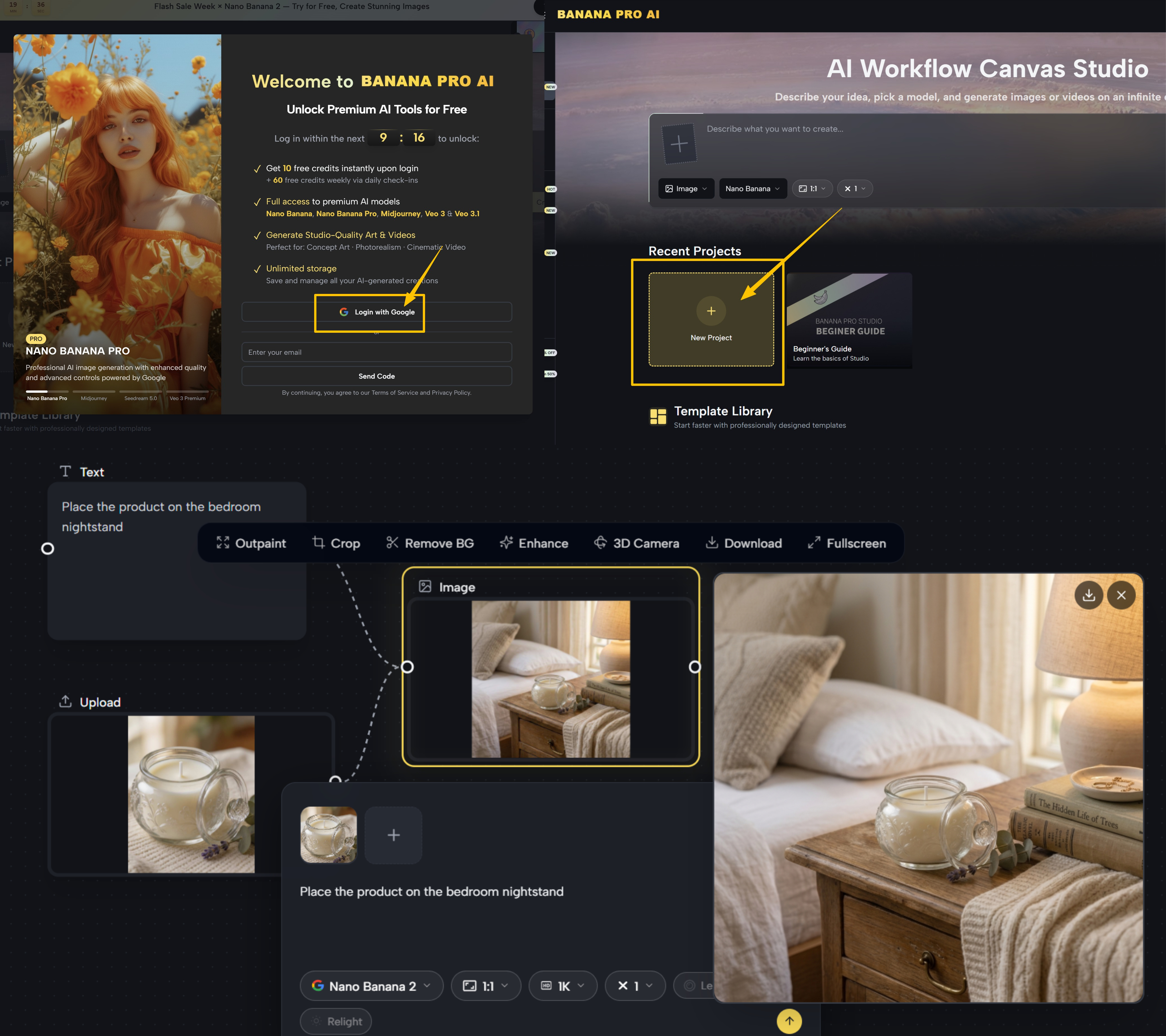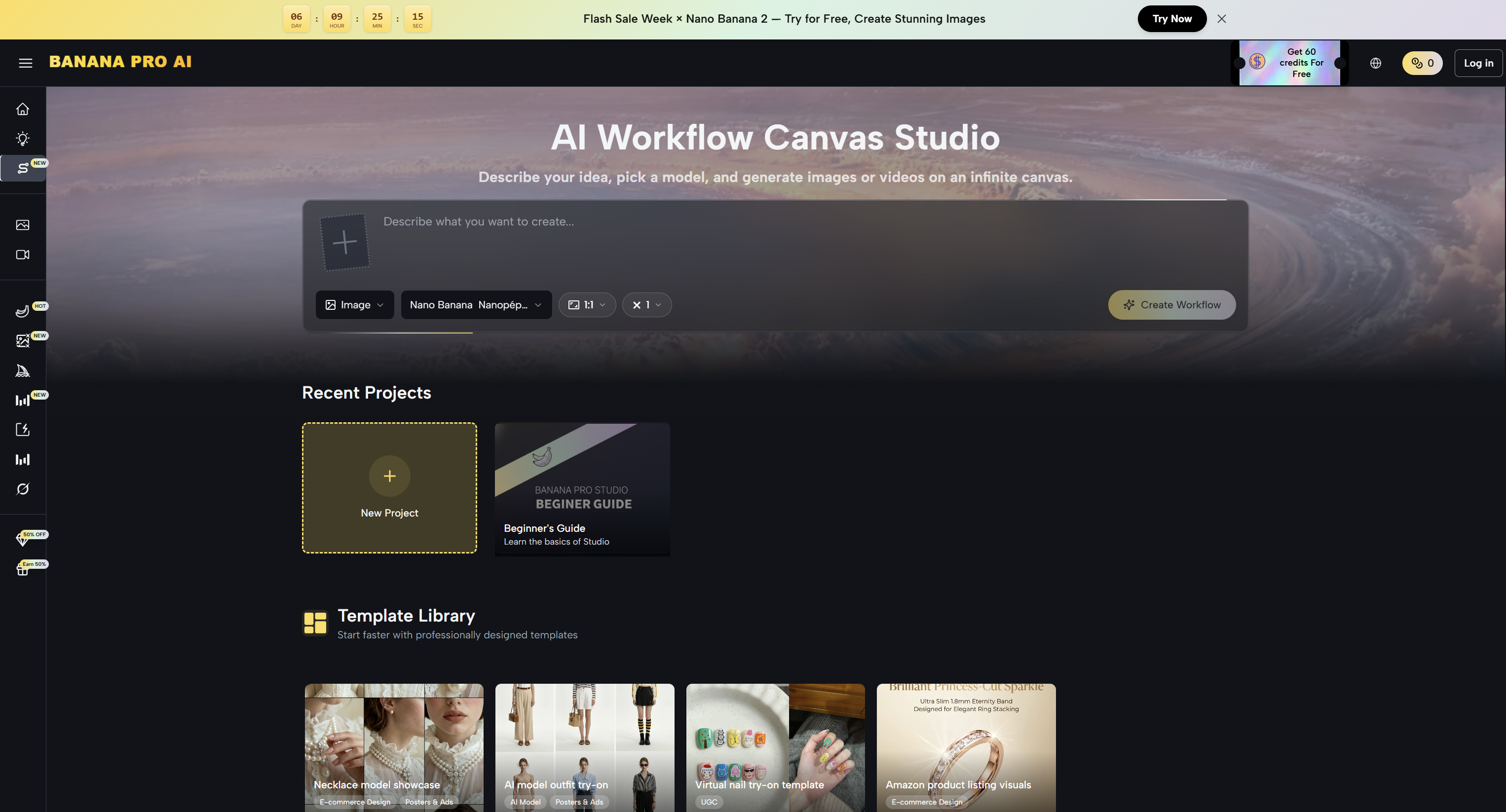 Navigate to BananaPro AI Workflow Studio and create a free account (no credit card required). You'll receive 10 free credits on sign-up, which is enough to test your first workflow immediately.