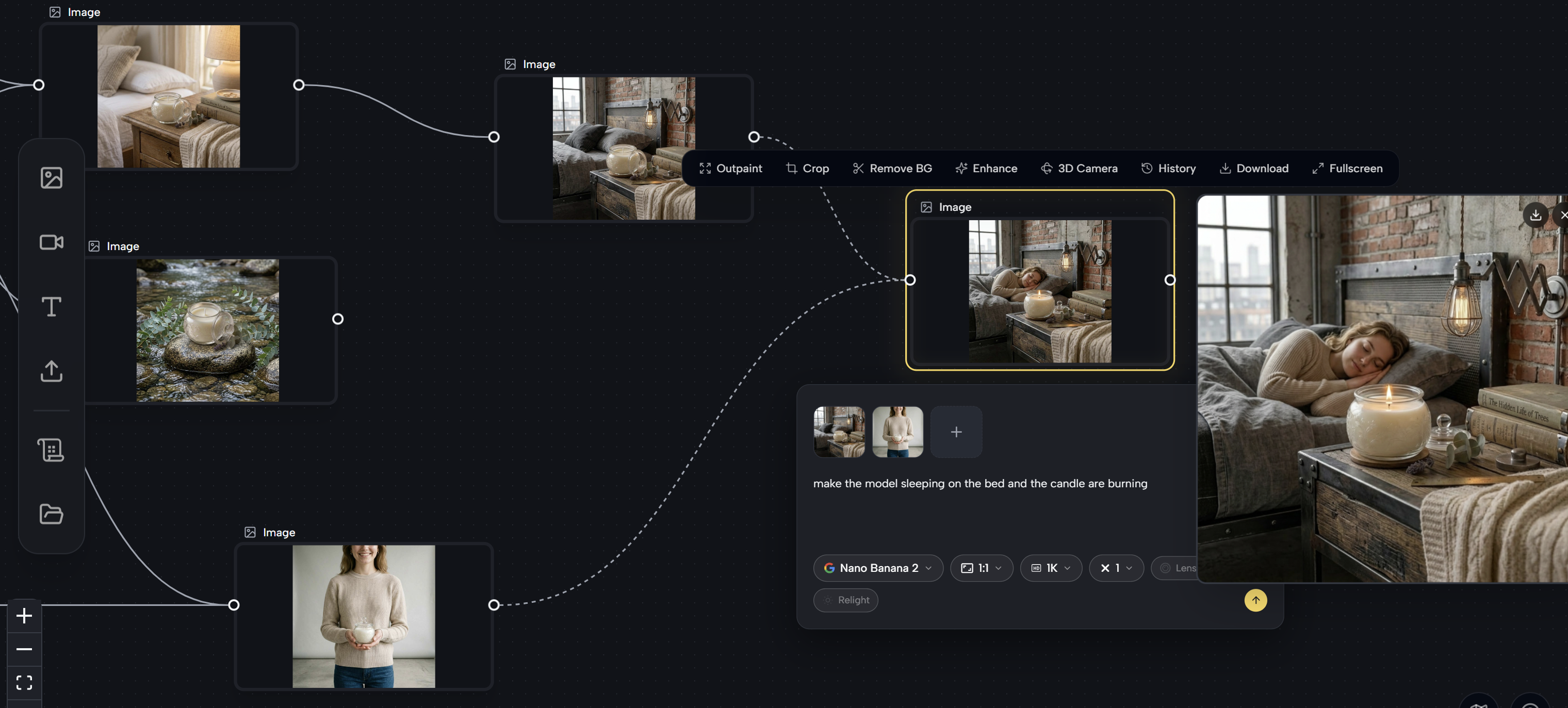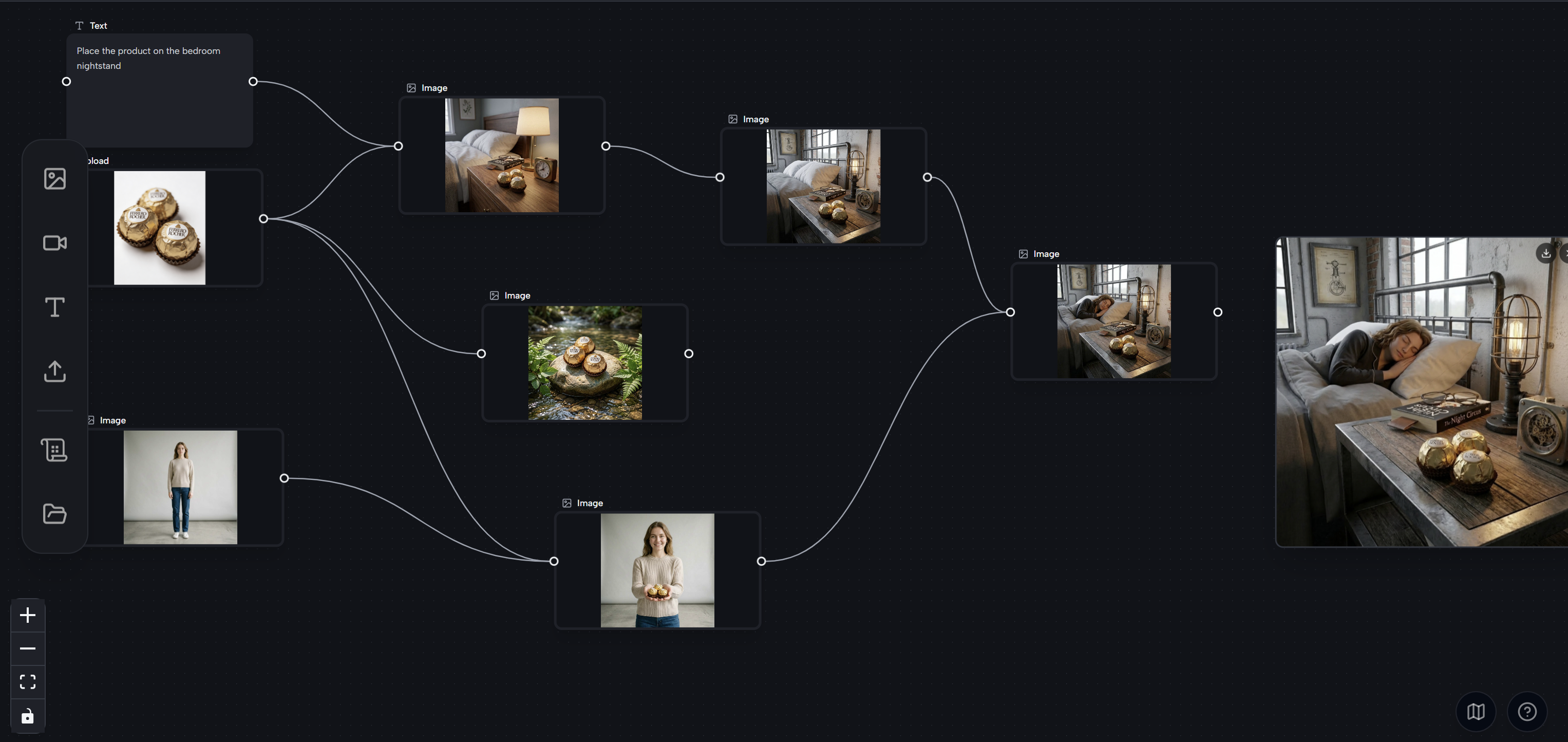 To merge two separate images into one scene — for example, placing both a model and a product into the same environment — you can connect multiple Upload nodes to a single Image node. Click the output port of the first image, drag to create a new generation frame, then connect the output port of the second image to the left input of that same frame.