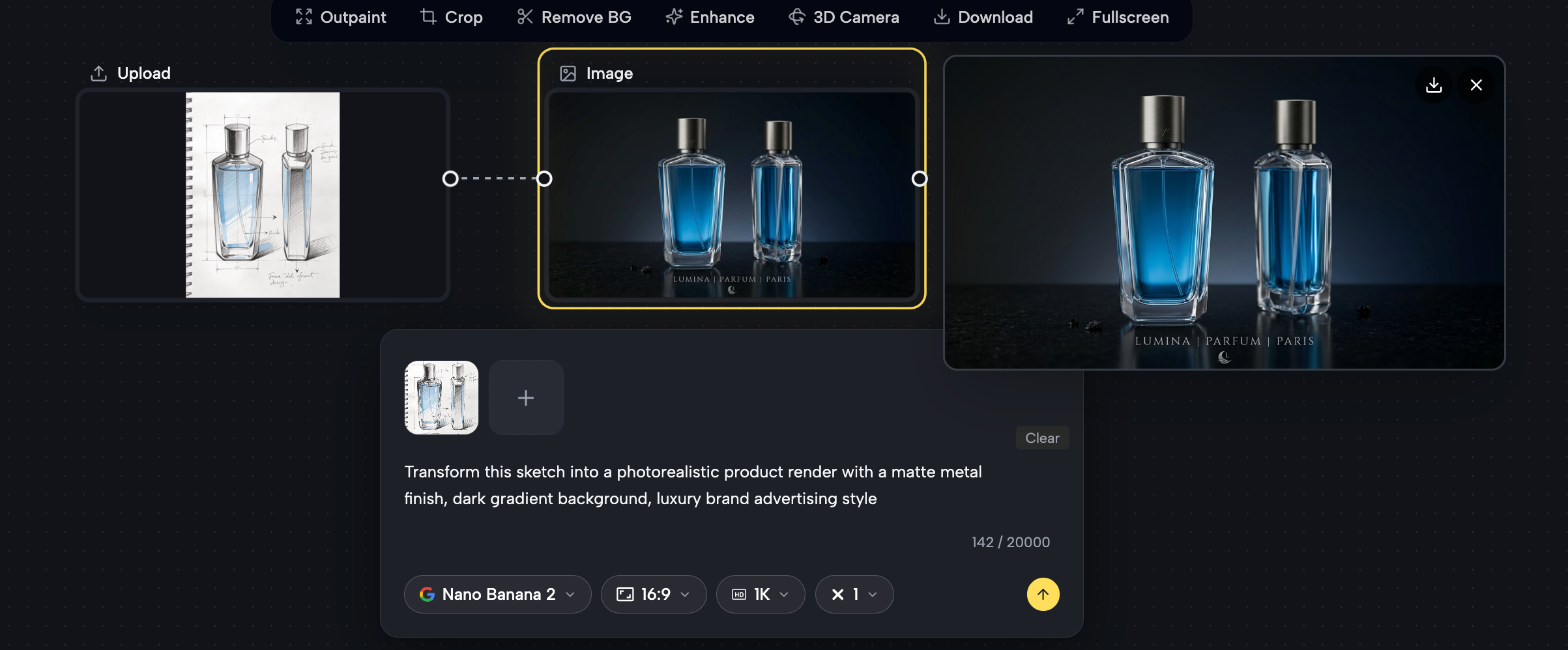 Step 2: Enter the following prompt: "Transform this sketch into a photorealistic product render with a matte metal finish, dark gradient background, luxury brand advertising style"