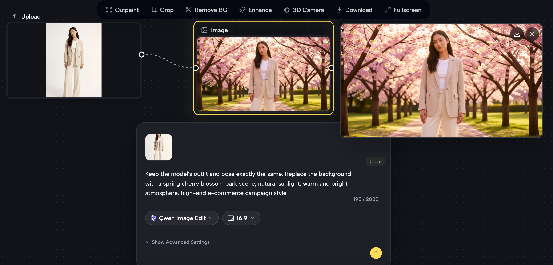 Step 2: Enter the following prompt: "Keep the model's outfit and pose exactly the same. Replace the background with a spring cherry blossom park scene, natural sunlight, warm and bright atmosphere, high-end e-commerce campaign style"