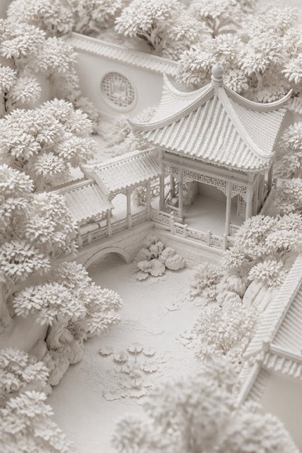 A vertical composition close-up shot, high-angle view looking down into a corner of a traditional Chinese garden courtyard. A pavilion connected by a small bridge, surrounded by dense trees. Three-quarter perspective, miniature effect, clay render style, monochromatic pure white, embossed paper texture, strong ambient occlusion, soft studio lighting, rich architectural details. --ar 2:3