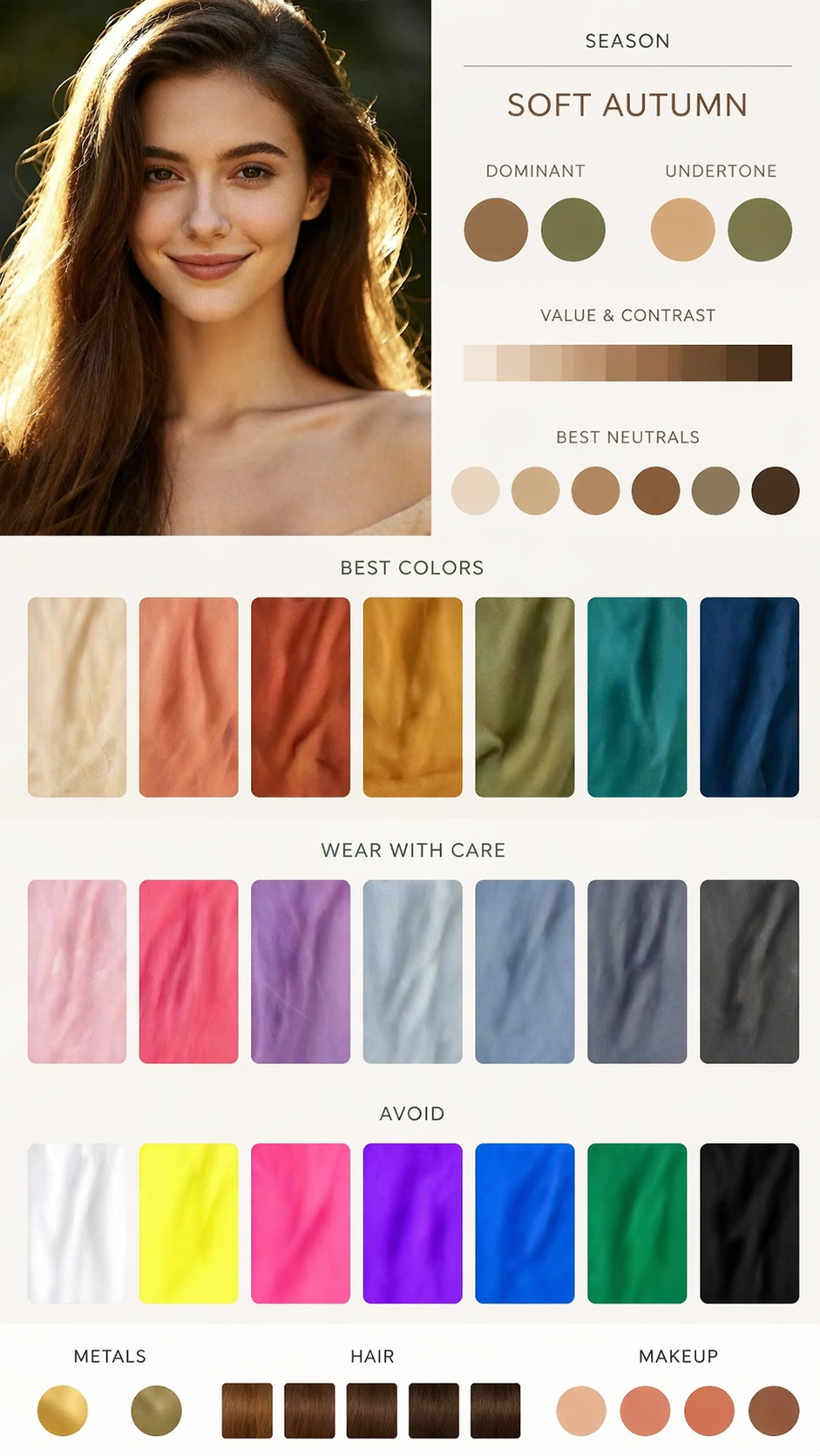 Using this portrait, create a diagram-first personal color analysis. Show which clothing colors suit the subject through visual comparison. Keep text minimal and avoid paragraphs