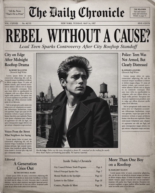 Create the most realistic front page design of a vintage newspaper featuring the main character. The layout should be made in the style of a real printed newspaper with a cinematic black-and-white aesthetic. The main photo should be prominently placed in the center, framed, like the image in the title of the article. The subject in the photo should remain unchanged and clearly distinguishable in natural light and slightly increased contrast in order to match the spectacular editorial style. Create a bold, attention-grabbing headline at the top (create a unique title that matches the spirit of the photo - it can be romantic, mysterious, funny, or dramatic). Add a smaller subtitle under it, which will look like a real newspaper caption. Add realistic newspaper elements: Columns of small text (in the style of lorem ipsum, but framed like real news) At the top is the fictitious name of the publication (for example, “The Daily Prompts”, “AI Times” or similar - think creatively, according to the picture) Date, issue number and location Decorative lines, dividers, and vintage typography Small additional articles or captions to the main image Optional stamps, doodles, or editorial notes to add personality. Style: Black and white or slightly faded monochrome paper Fine paper texture, grain, and ink defects Small shadows and creases that mimic real printed paper The aesthetics of a clean but slightly worn vintage newspaper Mood: Give the design personality, expressiveness and plot, as if the plot is part of the main article. Aspect ratio: 4:5 or 1:1 High-detail, ultra-realistic hybrid of editorial photography and print design.