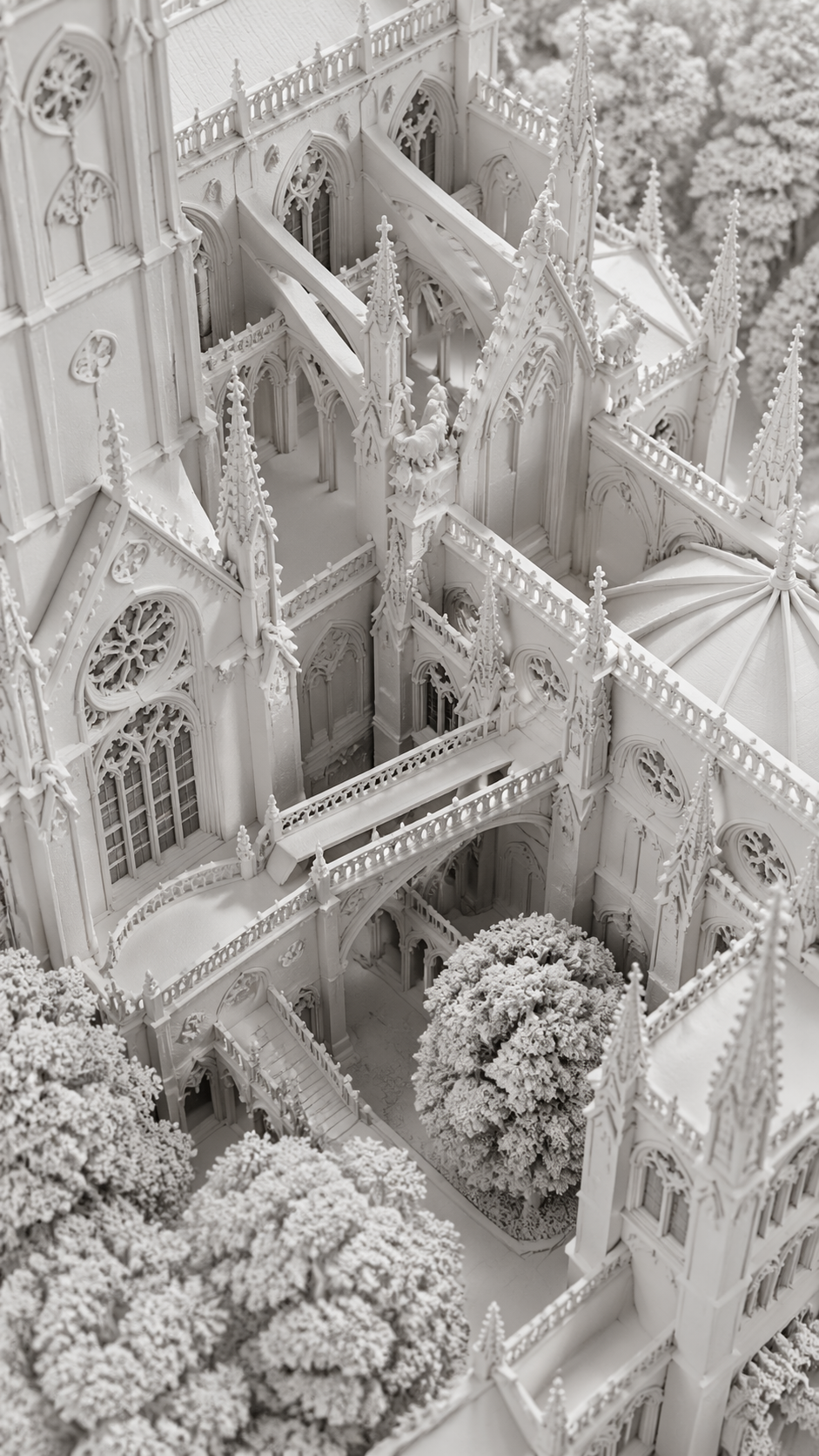 A vertical composition, close-up shot, high-angle bird's-eye view looking straight down into the corner of a Gothic cathedral. Soaring pointed arches, flying buttresses, intricate tracery windows, gargoyles perched on cornices, ribbed vaulted ceilings visible through open courtyards. A cloistered walkway connected by a stone arched bridge, surrounded by dense ancient oak trees. Three-quarter perspective with tilt-shift miniature effect. Clay render style, monochromatic pure white, embossed paper texture, strong ambient occlusion shadows, soft diffused studio lighting. Rich architectural details: crockets, finials, rose windows, pinnacles, quatrefoil ornaments. Ultra-detailed, architectural visualization, isometric diorama feel.