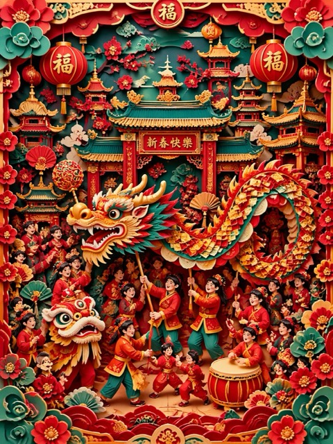 Eye-level straight-on view, looking directly into a hyper-vibrant 3D layered paper cut-out diorama. glowing China Red and Teal and Gold, extremely high saturation, maximalist composition, crowded festival scene with dragon dance and pagodas. Soft even studio lighting creating deep drop shadows between physical paper layers to define depth, matte paper texture, NO sun rays, NO volumetric lighting, octane render, 8k, clean details --ar 3:4 --stylize 450