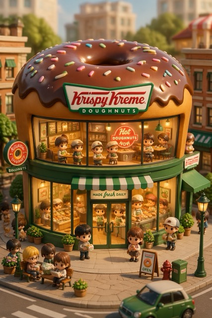3D chibi-style miniature concept store of {Brand Name}, creatively designed with an exterior inspired by the brand's most iconic product or packaging (such as a giant {brand's core product, e.g., chicken bucket/hamburger/donut/roast duck}). The store features two floors with large glass windows clearly showcasing the cozy and finely decorated interior: {brand's primary color}-themed decor, warm lighting, and busy staff dressed in outfits matching the brand. Adorable tiny figures stroll or sit along the street, surrounded by benches, street lamps, and potted plants, creating a charming urban scene. Rendered in a miniature cityscape style using Cinema 4D, with a blind-box toy aesthetic, rich in details and realism, and bathed in soft lighting that evokes a relaxing afternoon atmosphere. --ar 2:3