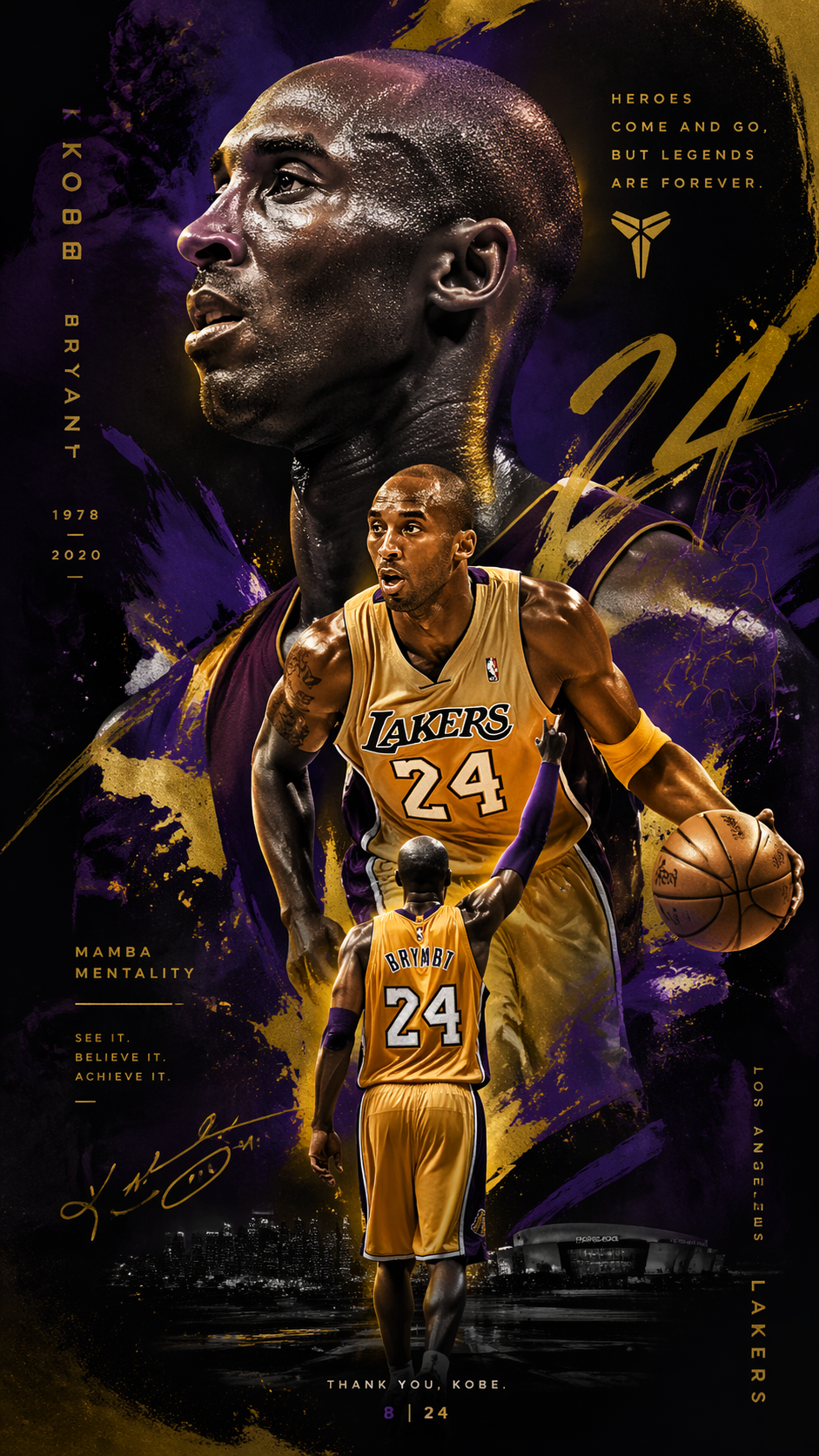Create a poster, a design of Kobe Bryant in Lakers uniform. Advanced design level, mobile wallpaper.