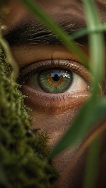 Ultra-realistic macro nature photograph of a human eye in an outdoor environment, the eye partially framed by natural elements such as soft moss, blurred leaves, or grass blades gently intersecting the foreground. The iris is hyper-detailed with organic radial textures, subtle color variation (earthy greens, ambers, or deep browns), reflecting the surrounding natural landscape (sky, trees, light). Skin texture is highly detailed — visible pores, fine lines, tiny imperfections, slight dryness and natural oil sheen, embracing a wabi-sabi aesthetic. Eyelashes are imperfect, slightly clumped, catching soft natural light. A faint layer of moisture on the eye adds realism with micro reflections. Lighting is natural golden hour or diffused overcast daylight, soft and directional, creating gentle highlights and shadow falloff across the skin and iris. Shot with extremely shallow depth of field — only a thin slice of the iris in sharp focus, foreground and background melting into creamy, dreamy bokeh with organic shapes. Color grading follows analog 35mm film characteristics — soft contrast curve, slightly muted highlights, warm tones, subtle green shadows, natural color rendering. Fine film grain, slight halation, and micro imperfections (dust, light leaks, softness at edges). Composition: macro framing, eye slightly off-center, vertical 9:16 aspect ratio, immersive and intimate perspective. Lens & camera feel: 100mm macro lens, f/2 or wider, shallow DOF, handheld micro imperfections, cinematic realism, 8K detail. Mood: quiet, intimate, poetic, grounded in nature — human + earth connection.
