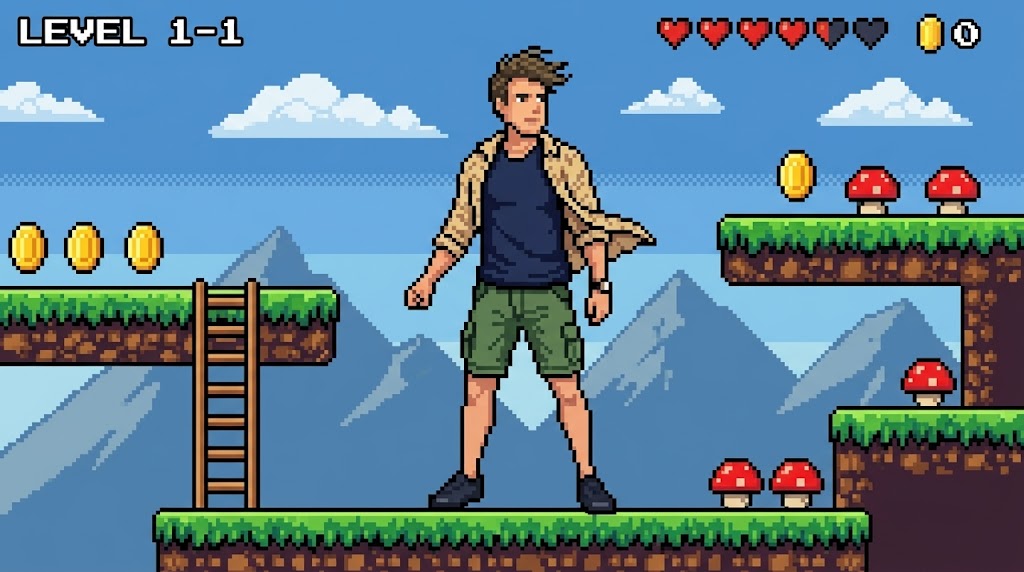 The 16-Bit Character Generator takes a photo of a person and transforms that subject into a retro pixel-style character. More specifically, it creates a full image where the subject becomes a 16-Bit video game character placed inside a platform-inspired pixel world. That makes the output feel like a complete game frame rather than a simple pixel portrait.