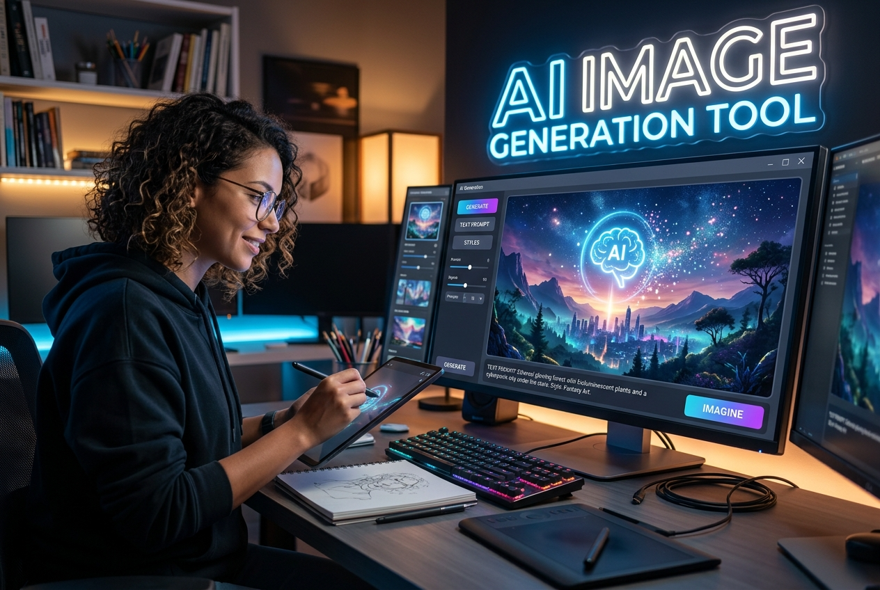 An AI image generation tool is a platform that creates images from text prompts or creative instructions using artificial intelligence. This AI image generation tool helps users produce visuals quickly without traditional design software.