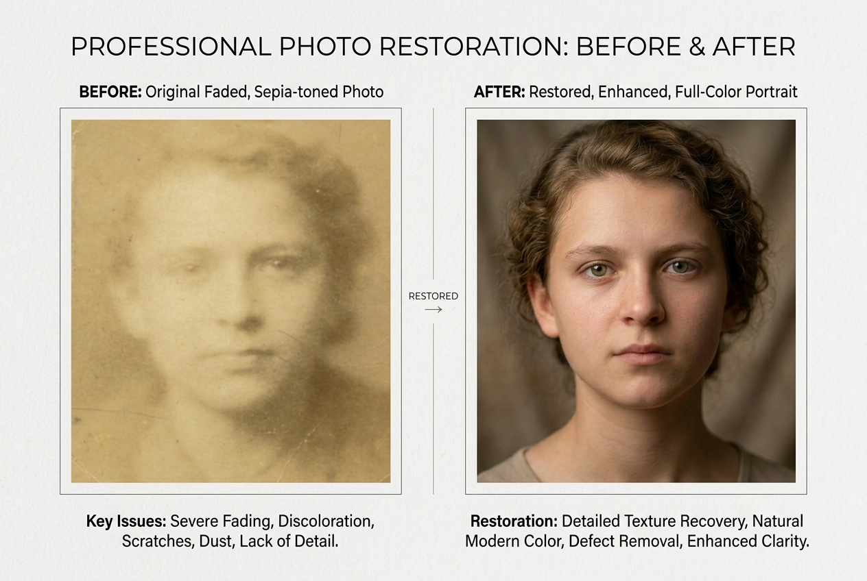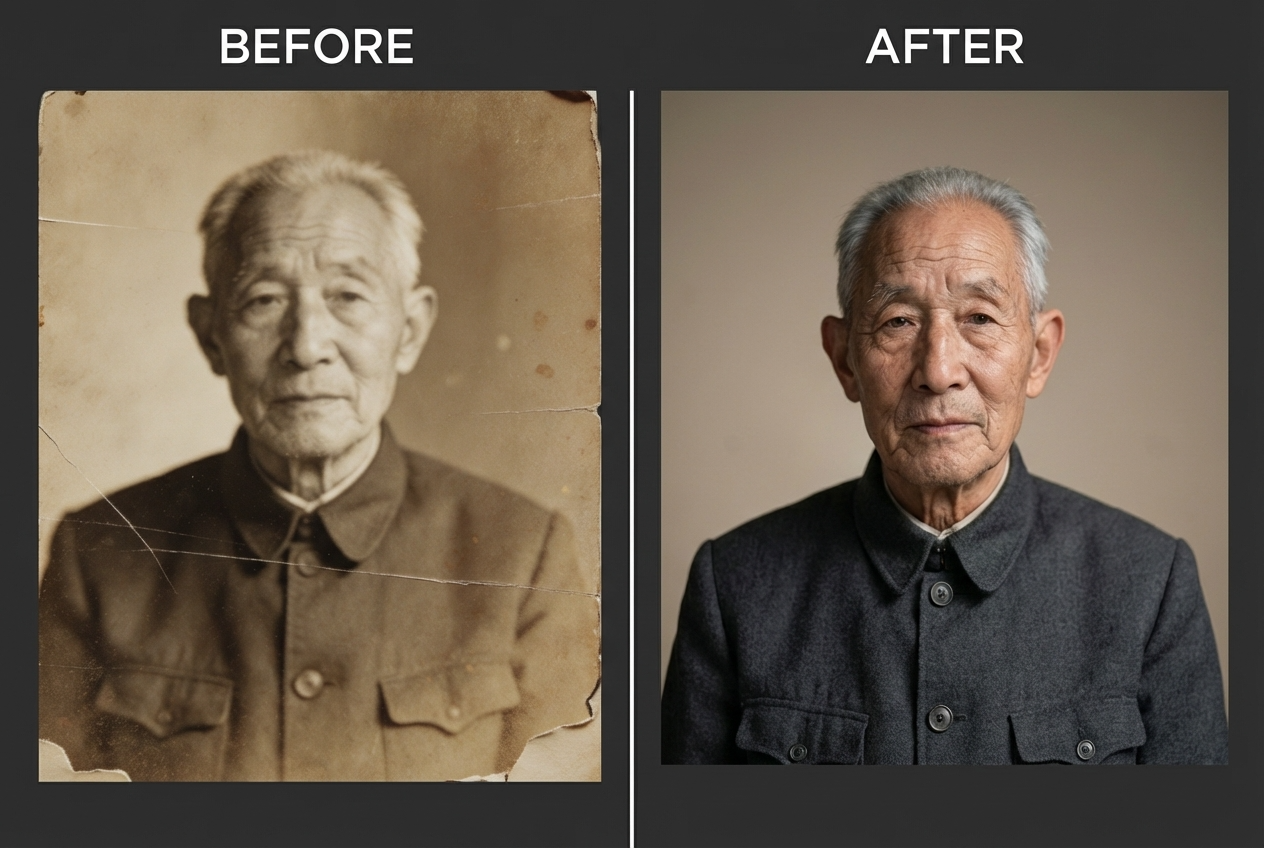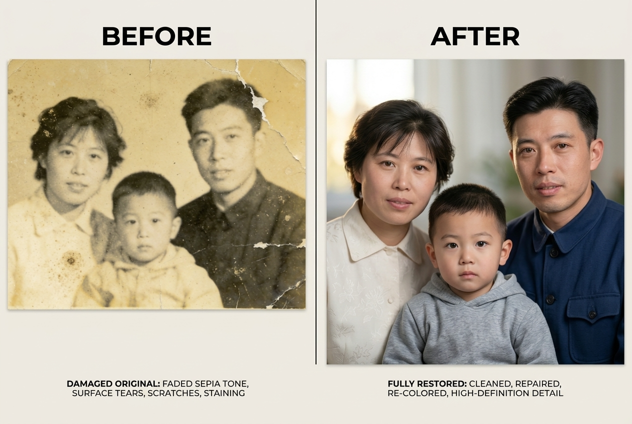 Use BananaPro AI Photo Restoration tool to restore old photos free in seconds. Our AI photo restoration workflow helps repair scratches, fading, blur, creases, stains, and age damage while keeping faces, clothing, and background details natural. Whether you want to restore old photos free for family archives, memorial images, scanned prints, or vintage portraits, BananaPro AI gives you fast, clean, and realistic results directly in your browser.